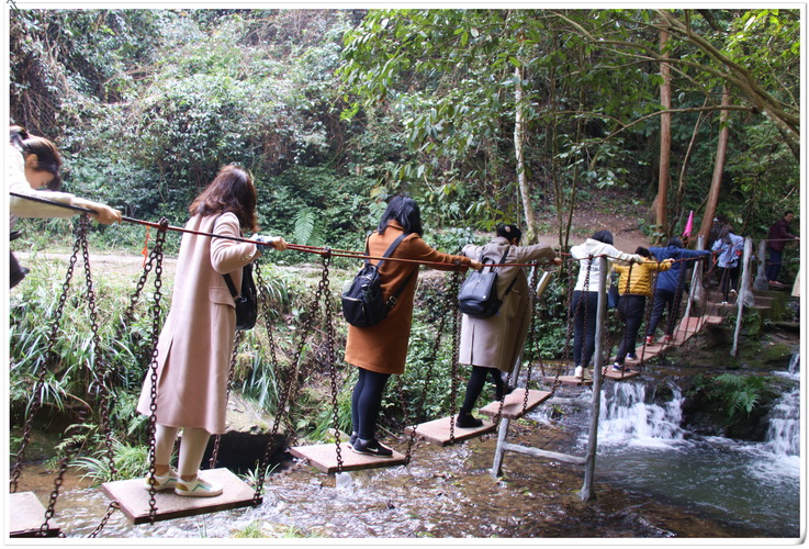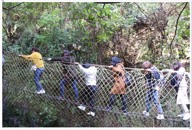 本次春游第一站為皇龍大峽谷。峽谷內(nèi),綠樹(shù)成蔭,溪水潺潺,入眼滿是原生態(tài)植被山林。沿著山路,景區(qū)內(nèi)精心設(shè)計(jì)的浮動(dòng)梅花樁、鐵索橋、壁虎網(wǎng)等道路并沒(méi)有困住湘咨姑娘們向上的腳步。大家不懼挑戰(zhàn)之險(xiǎn),不畏攀登之苦,努力跨越沿途障礙,收獲了諸多樂(lè)趣。