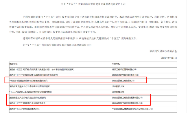近日,根據衡陽市和湘西州發(fā)展改革委“十五五”規(guī)劃前期研究重大課題遴選結果公示,湘咨集團成功中標《衡陽市優(yōu)化投資結構和提升投資效益研究》《衡陽縣域經濟高質量發(fā)展研究》《湘西州生態(tài)產品價值實現路徑與機制研究》《湘西州“十五五"新能源產業(yè)專題研究報告》《“十五五”全面提升全州項目儲備質量的研究》等多個課題。